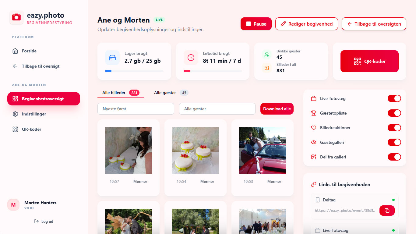 Som vært har du fuld kontrol over din begivenhed. Administrer billeder, download højkvalitetsoriginale og tilpas dine begivenhedsindstillinger.
